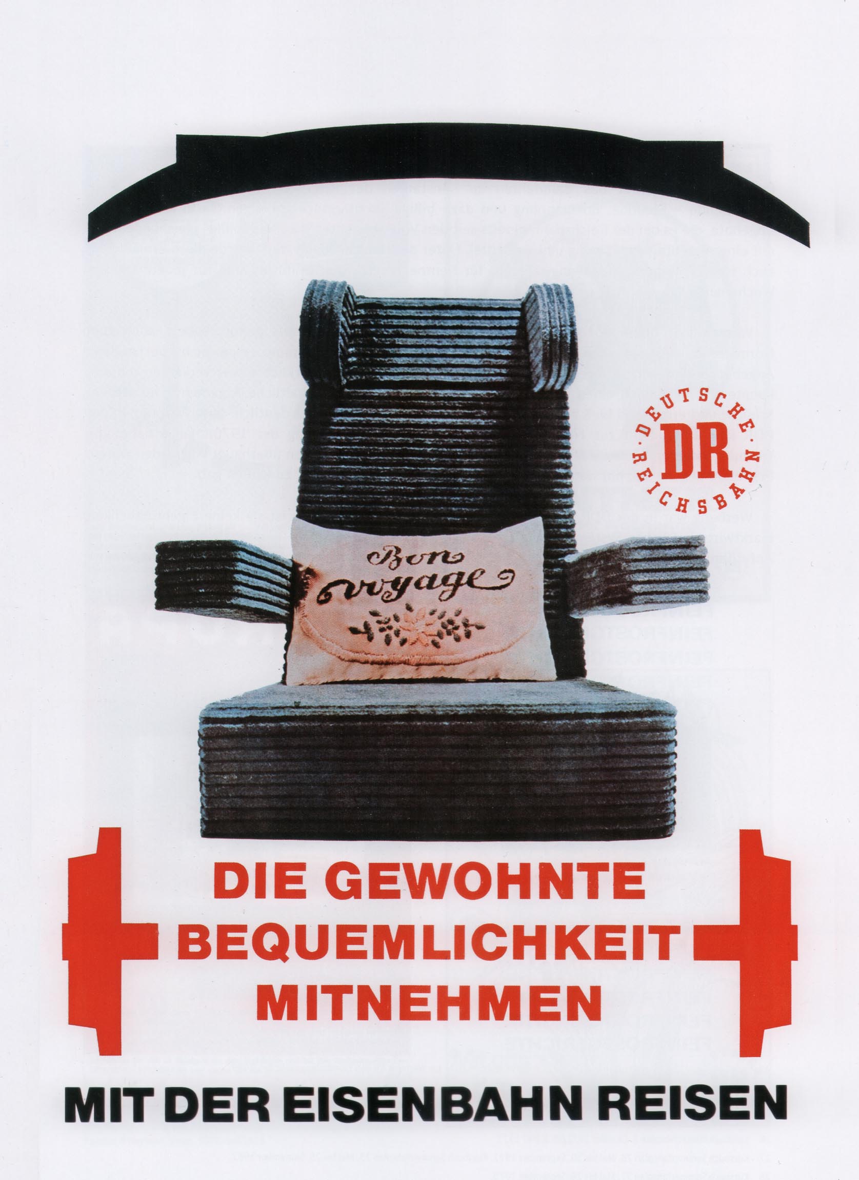 In 1969 a series of four DR posters about 'Mit der Eisenbahn reisen' (Traveling by railway) appeared, each featuring a train seat against a white background. For example, a first-class seat with a cushion embroidered 'Bon Voyage'. The text on this poster reads: 'Die gewohnte bequemlichkeit mitnehmen', that is: take your familiar comforts with you. All that's missing is a houseplant.