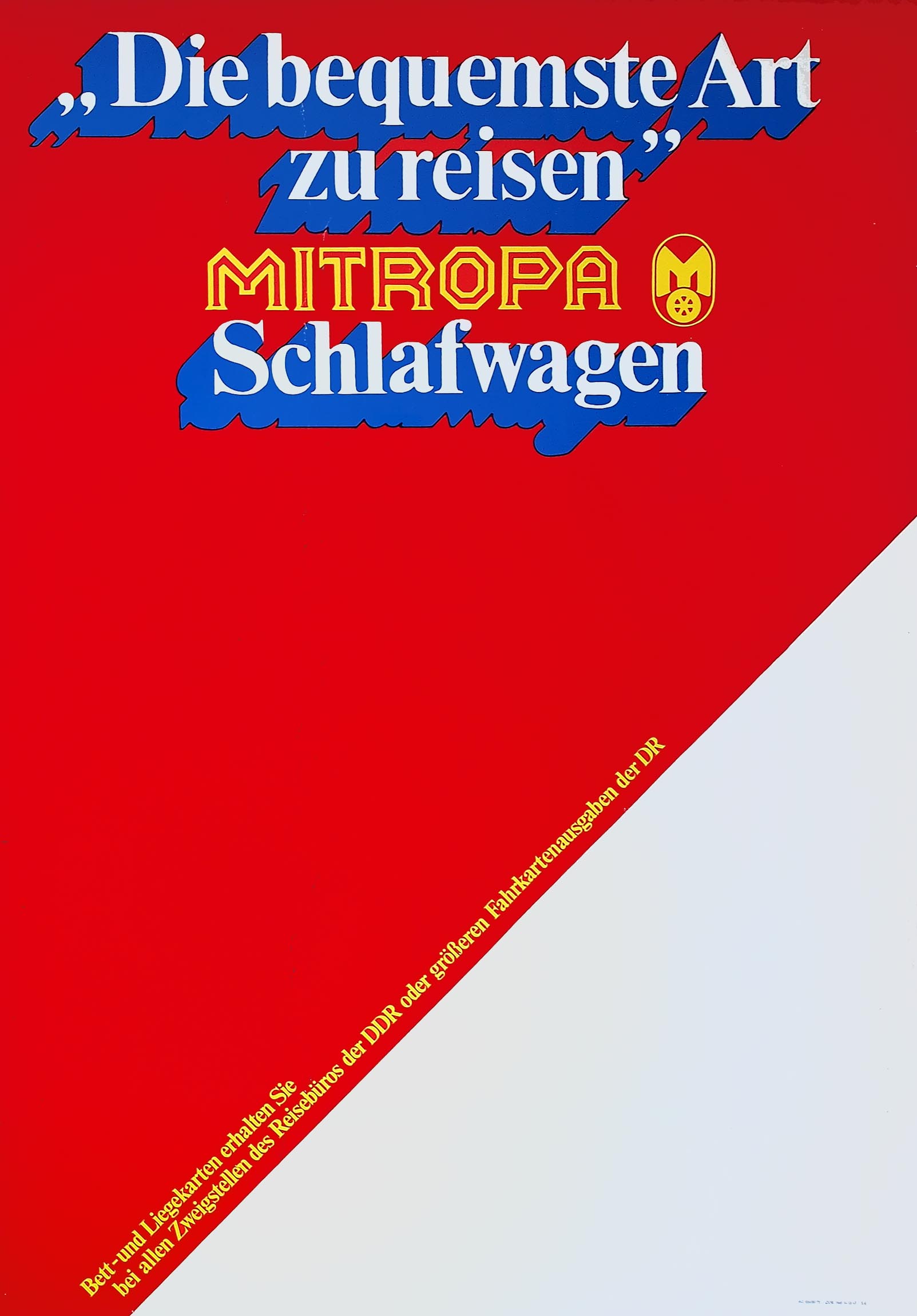Sleeping cars remained a core activity. Around 1980 Mitropa advertised sleeper tickets with the slogan 'Die bequemste Art zu reisen' (the most comfortable way of traveling) on a simple poster featuring red and white color planes. Perhaps these where meant to represent a folded blanket and sheet.