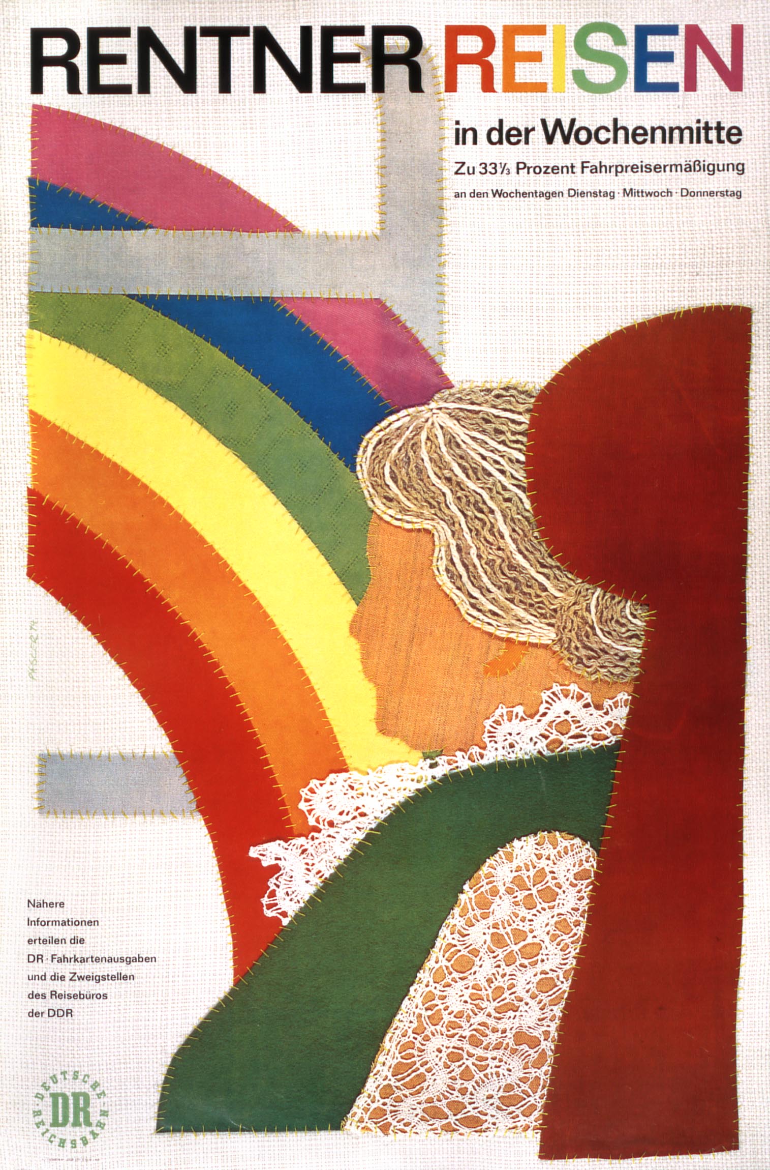 The front view of this locomotive reappeared in a 1974 poster by Helmut and Christa Grumm. 'Sonntags Rückfahrkarten' offered a one-third discount on Sunday train journeys up to 100 kilometers. The poster suggested visits to interesting cities, concerts, theater or nature. Meanwhile Eugen Päsler had continued on his own and created a poster for senior citizen discounts (Rentner Reisen). It was made of felt, wool and lace sewn onto fabric, featuring a colorful rainbow motif. These designs are on par with railway posters from Western Europe of the period.