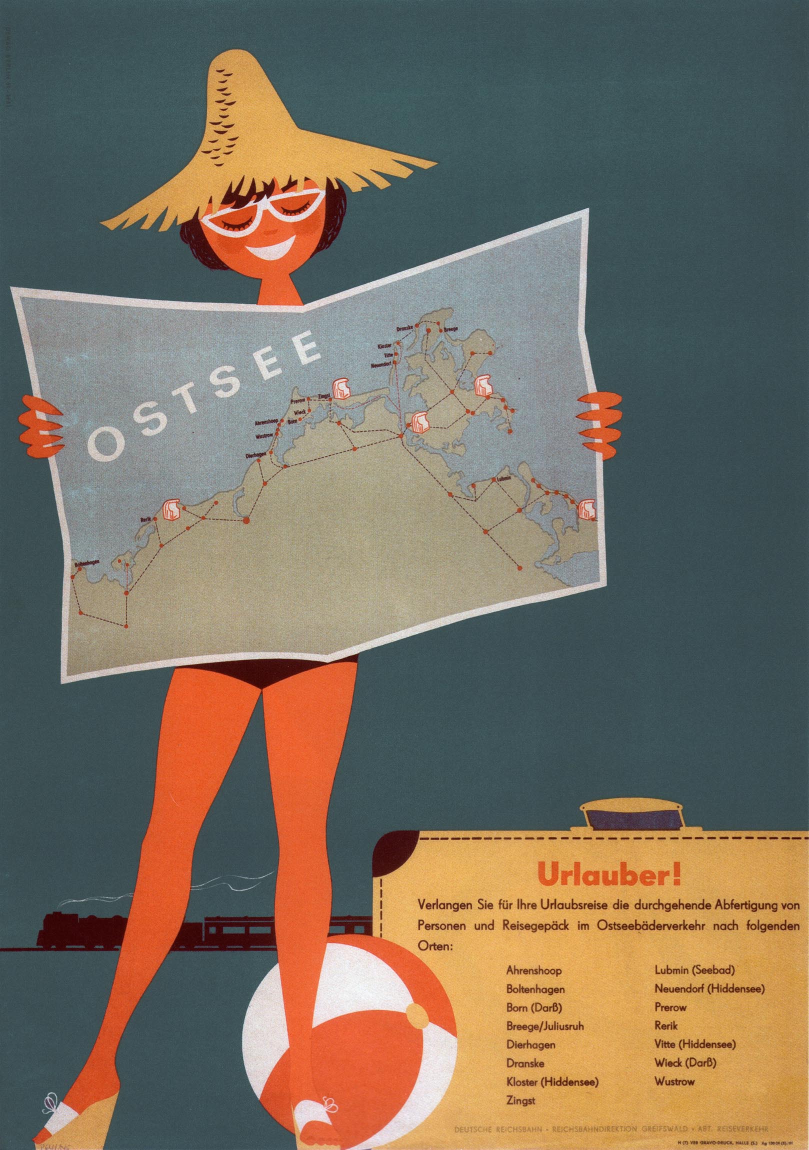 Popular destinations included the Baltic Sea islands of Rügen and Usedom, and inland the Harz mountains, the Thuringian Forest, and certainly Saxon Switzerland , the area between Dresden and the Czechoslovak border. The Reichsbahndirektion Cottbus published a horizontal poster showing a train running between the Elbe River and the sandstone cliffs (the timetable could be printed in the white box). 'Ostseetourismus' to the Baltic Sea was promoted with a poster showing a bather holding up a map of seaside resorts served by shuttle service from the train stations.
