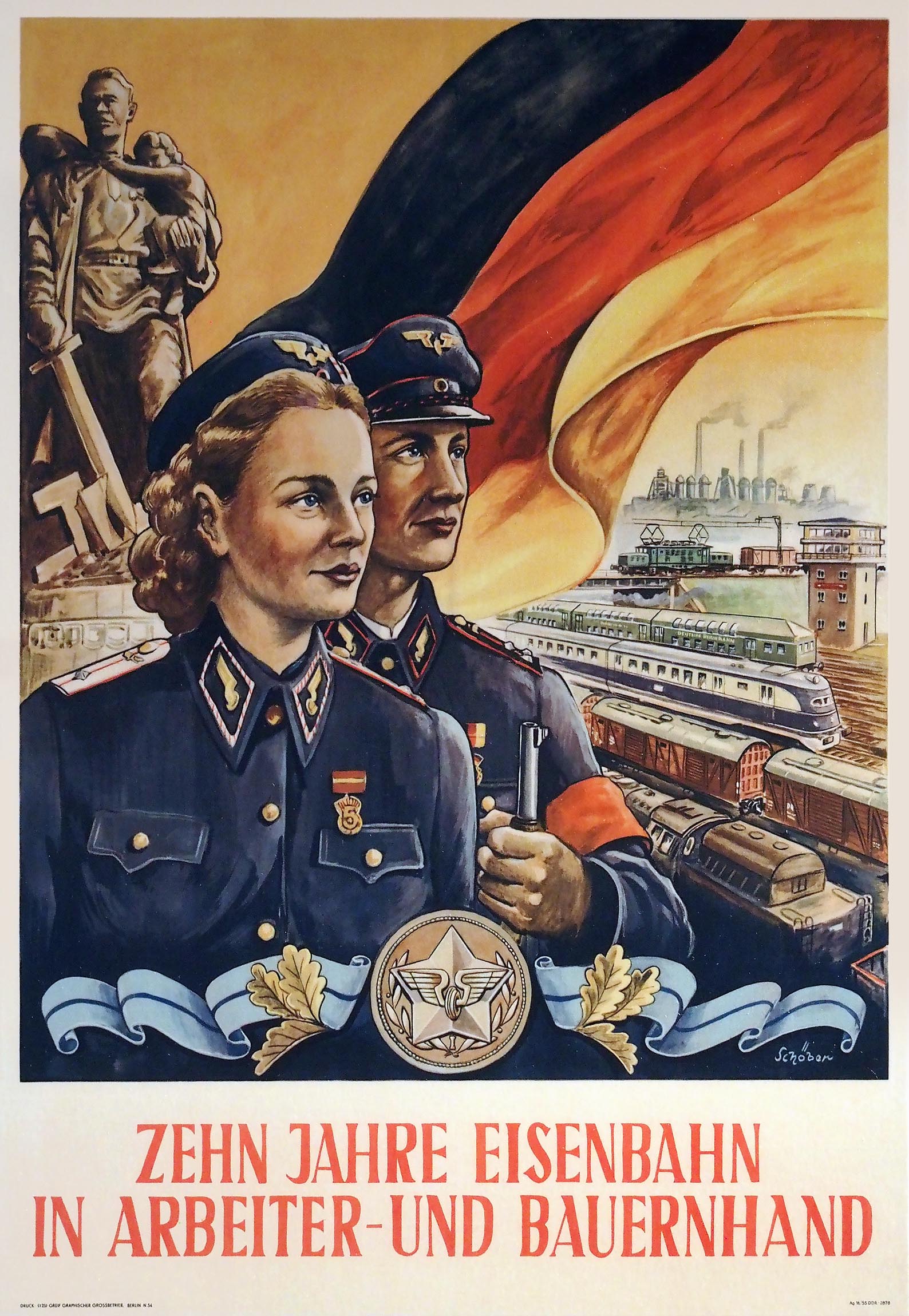 Both posters were created in the socialist realist style of the Stalin era by an artist called Schöber, about whom nothing else is known. He (or she) continued to create posters for the Tag des Eisenbahners for decades, continually adapting his style to the spirit of the times. Socialist realism was over by 1960, and after that design styles aligned with global trends.