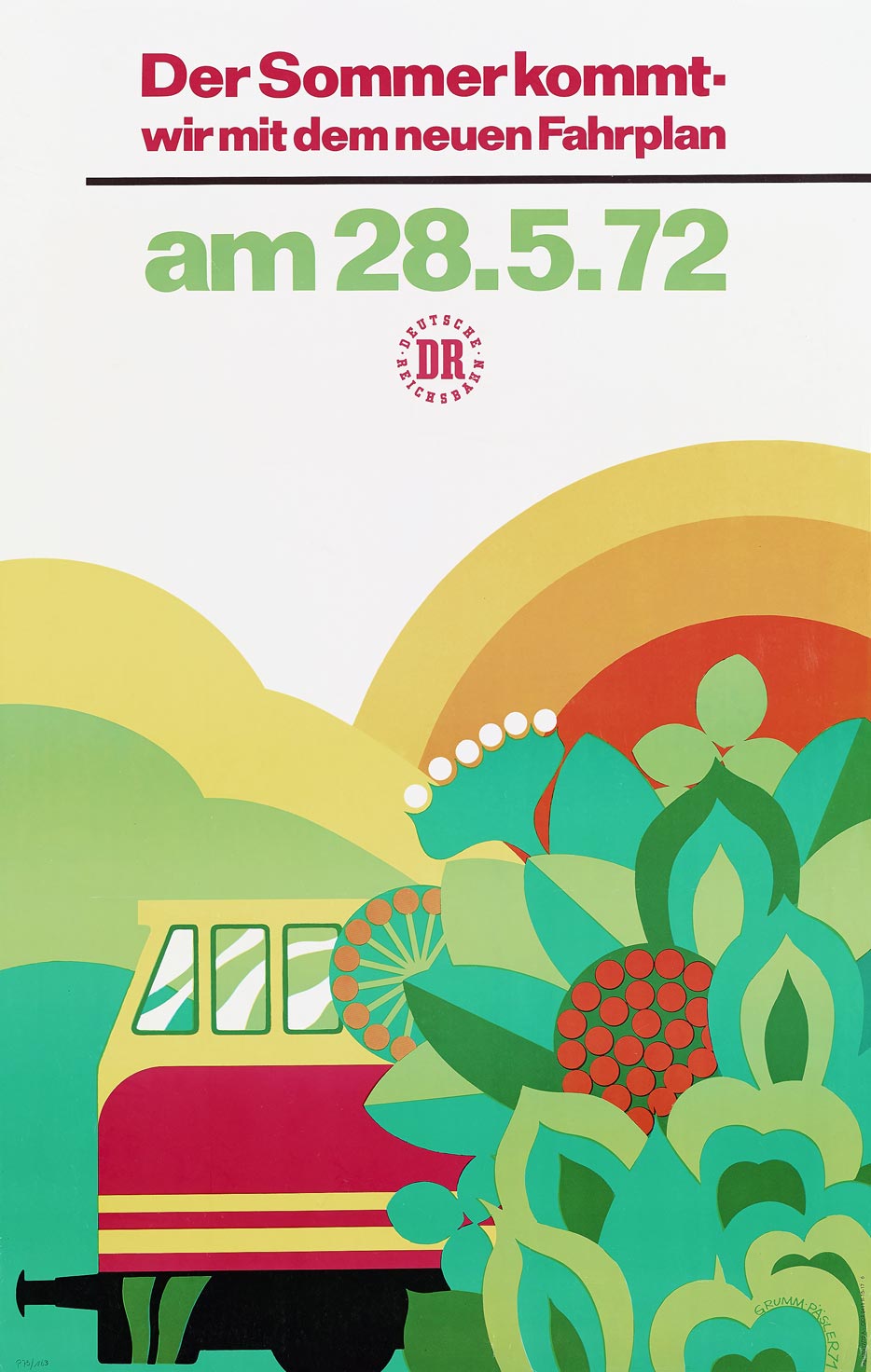 Many GDR railway posters of the 1960s and 1970s were created by the Berlin graphic design collective Bartel-Grumm-Päsler. They also created book covers, illustrations and film posters. Members were Walter Bartel, Eugen Päsler and the couple Helmut and Christa Grumm. In 1968 Walter Bartel fell ill, and four years later Eugen Päsler also left the collective, which gradually adopted a shorter name: Grumm-Päsler and eventually Grumm, although there were still two designers behind that name.