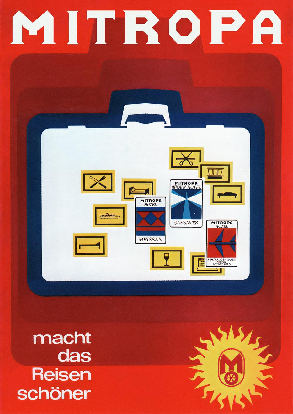 Besides sleeping and dining cars, Mitropa also operated station restaurants and buffets on ferries in the GDR. In the 1960s, motorway restaurants, gas station kiosks and hotels followed, such as those at Meissen station, the Berlin-Schönefeld airport hotel, and the Rügen Hotel in Sassnitz on the Baltic Sea. These hotels are visible as luggage labels on a Mitropa poster featuring a stylized suitcase. In 1971 the company opened its first motel along a highway near Neubrandenburg.