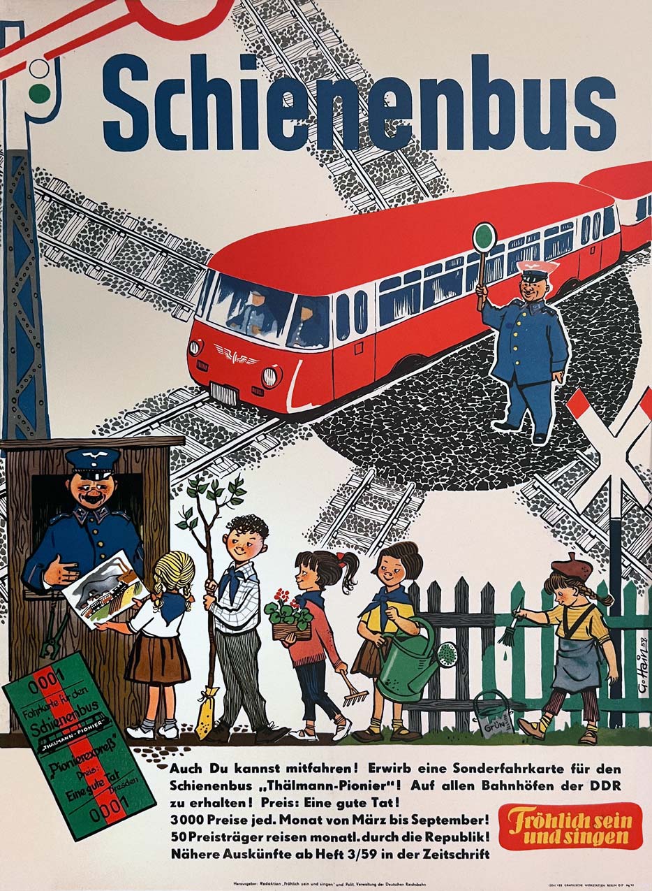 The Schienenbus was designed for small-scale passenger transport on secondary railway lines, but it was used by the Young Pioneers to crisscross the country and spread their message. Tickets were available at every station, the price: one good deed. 'No one is too small to fight for the preservation of peace', GDR prime minister Otto Grotewohl exclaimed at the inauguration. The poster, issued by the Deutsche Reichsbahn (DR) in collaboration with the pioneer magazine Fröhlich sein und singen was created by cartoonist Günter Hain.